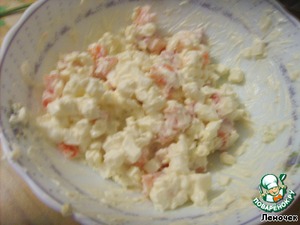Приготовить начинку. Яйца и рыбу порезать кубиками, лук измельчить. Все соединить и добавить майонез. Тщательно перемешать