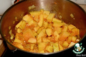 Тыкву добавить к луку, тушить 1 минуту, помешивая. Далее добавить бульон или кипяток и варить суп до готовности тыквы (30 минут).