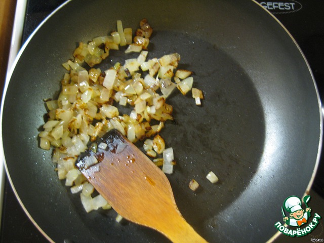 Далее чистим лук, шинкуем, обжариваем в небольшом количестве масла.