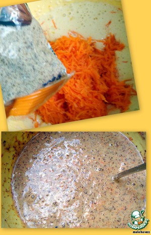Затем тёртую на мелкой терке сырую морковь, миндаль, муку, разрыхлитель. Цедру лимона (натертую). Хорошо размешать.