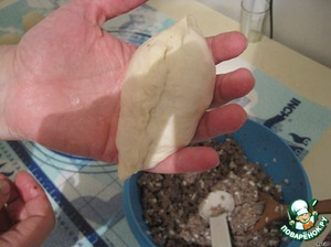 Теперь берем шарик, переворачиваем швом к верху и начинаем его разминать без усилий по кругу, не прилагая усилий.