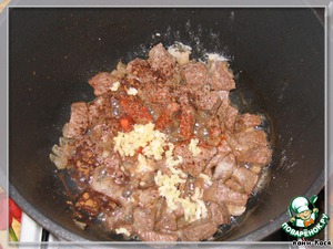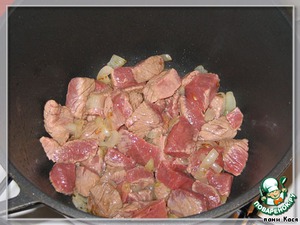 Туда кидаем мясо (огонь приличный, мешаем быстро, обжариваем активно).