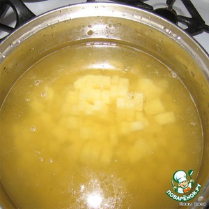 • Ставим бульон на огонь, проверяем на соль, закидываем вариться картошку