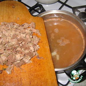 • Мясо из готового бульона вынимаем, если на костях - обираем мякоть, режем кусочками