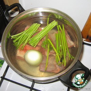 • Варим бульон, я обязательно кладу луковицу целиком и связочку зелени (потом то и другое выкидываем)