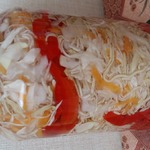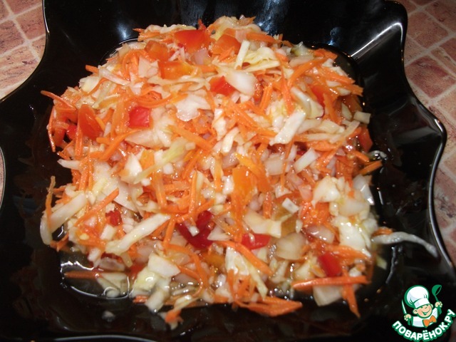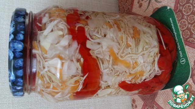 Тщательно перемешиваем капусту, морковь, перец болгарский и лук. Заливаем маринадом. Тщательно перемешиваем. Сложить в эмалированное ведро и дать постоять 2 суток.