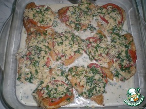 Потом перекладываем все в блюдо для запекания, укладываем на каждый кусочек курицы дольку помидора, заливаем все сливками и ставим в духовку на 15 минут (180 с) за 5 минут до готовности посыпаем все сыром.