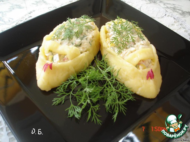 Все перемешать, добавить зелень и майонез, уложить в башмачки, украсить зеленью.