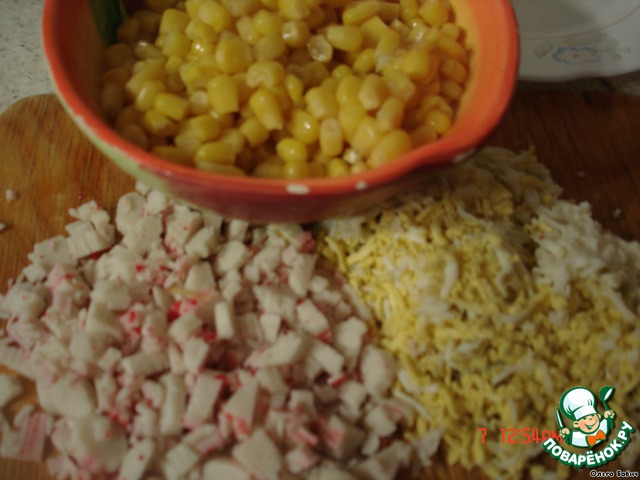 Яйцо натираем на терке, крабовые палочки режeм мелко, добавляем кукурузку.