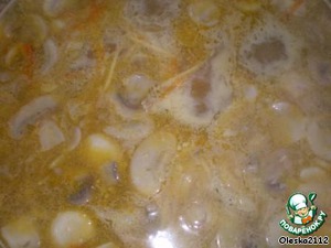 В кипящий куриный бульон всыпаем лапшу (лучше конечно домашнюю, но ведь нет времени :-D ) и сразу же добавляем пассерованные овощи и грибы. Солим нашу лапшу (если не солили бульон). Добавляем специи и лавровый лист.