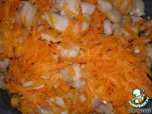 На следующий день (или в этот же)лук мелко режем, морковь трём на тёрке. На сковороду наливаем растительное масло (немного) и добавляем лук и морковь. Всё пассеруем до мягкости. Режем грибы и добавляем на сковороду к луку и моркови. Всё обжариваем до мягкости шампиньонов.