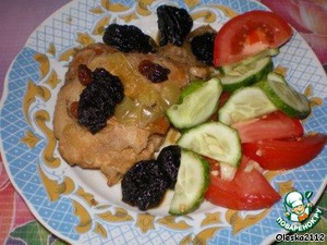 Курицу подаём с гарниром отварной. Я если беру курочку которая пожила своё, то предпочитаю её потомить в духовке с черносливом и изюмом. Обязательно подливаю немножко бульона, чтобы была сочнее. Посмотреть приготовление курицы можно здесь https://www.povarenok.ru/recipes/show/33074/ . В такую курочку перец болгарский я обычно не добавляю.