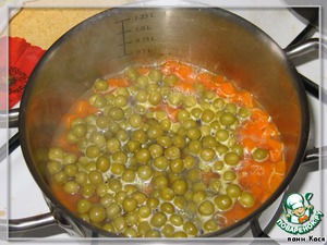 Когда морковка наполовину готова, кидаем туда горошек (у меня консервированный)