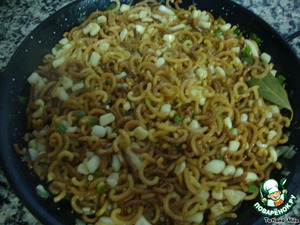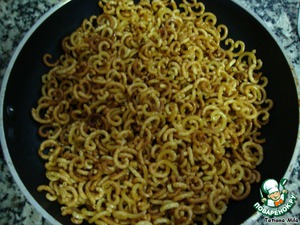 На другой сковороде, в небольшом количестве оливкового масла, обжариваем наши макарошки до золотистого цвета. Вообще-то, в идеале макароны надо обжаривать вместе с овощами и каракатицей, но так как она дала сок, то мне пришлось это делать на другой сковороде.