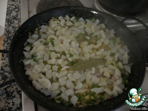 На разогретой сковороде, в небольшом количестве оливкового масла, обжариваем мелко порезанный лук, чеснок и перец около 10 минут, добавляем лавровый лист и черный молотый перец.