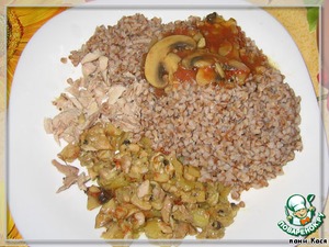 • Перчик и грибы мелко порубим, добавим куриное мясо вареное (помните, у нас не съелись ножки из супа?), сварим гречку.
