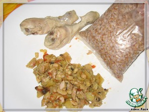 Перчик и грибы мелко порубим, добавим куриное мясо вареное (помните, у нас не съелись ножки из супа?), сварим гречку.
