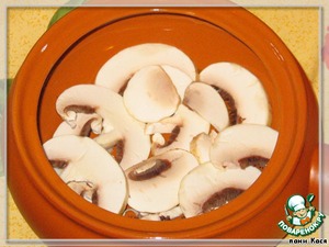 • 3 гриб порежем тонкими пластинками, уложим на дно горшочка.