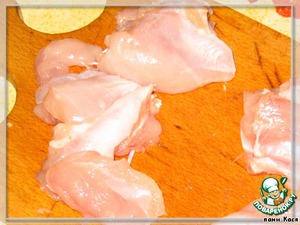 4 голени (по количеству перцев) разделаем на филе, тоже мелко нарубим.