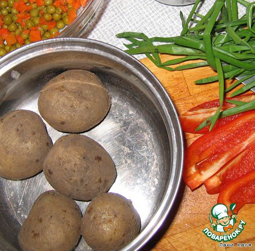 яйца сварить вкрутую, картофель сварить в мундире, перец почистить, порезать полосками, потом кубиками