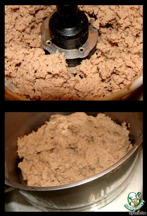 Полуостывшее мясо и печень режем на кусочки и вместе с луком перемалываем в блендере.