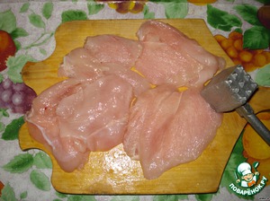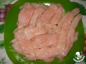 Размороженное филе курицы порезать небольшими прямоугольниками и слегка отбить.