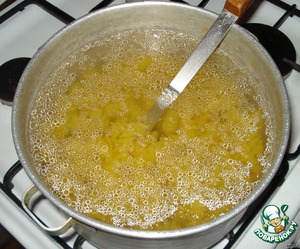 В кипящую воду добавить 1 столовую ложку растительного масла, для того чтобы они не слиплись, посолить и высыпать макароны. Варить около 7 мин до готовности.