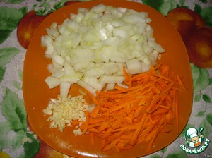 Лук и чеснок порезать кубиками, морковь порезать полосками.