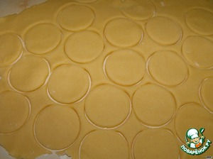 Белое тесто раскатать в тонкий пласт, стаканом выдавить кружочки.