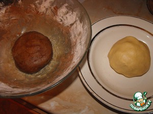 раскатать по отдельности темное и светлое тесто в тонкий пласт.