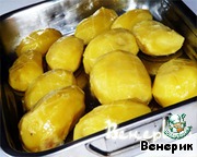 Затем налить в противень любое (по вкусу) растительное масло (столько, чтобы картошка немного плавала в нём), обвалять в нем картофель...