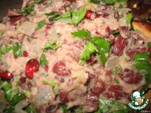 • Мелко режем кинзу, чеснок пропускаем через "чеснокодавилку", а из фасоли делаем пюре, но не совсем, лучше если цельные фасолинки попадают в закуске.