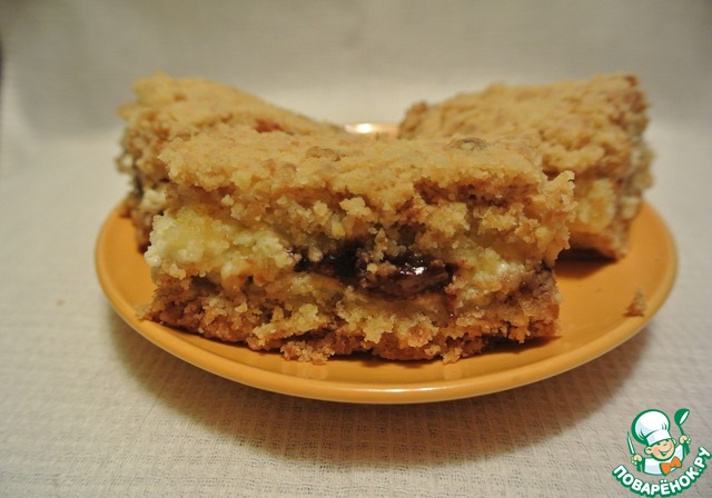 6 ) выложить в форму половину теста, разровнять, сверху выложить творог, присыпать оставшимся тестом