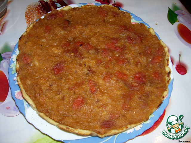 Застилаем форму бумагой для выпечки, смазываем маслом и выкладываем наше тесто, вынутое из холодильника (я не раскатываю, просто формирую руками). Сверху кладем начинку и ставим в предварительно разогретую духовку минут на 30.