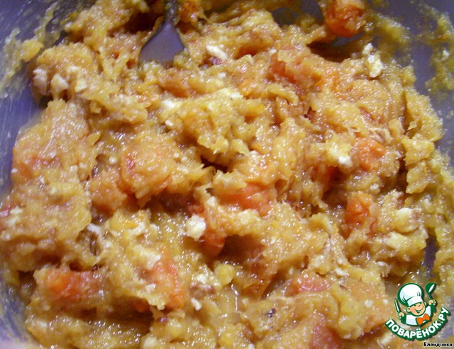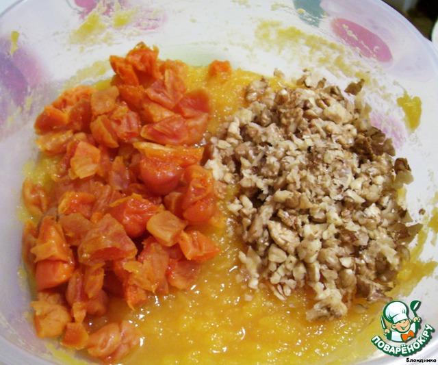 Тщательно промытую и замоченную в горячей воде курагу нарезаем кусочками (честно говоря, советую нарезать помельче, чем у меня на фото - тогда готовый пирог будет удобнее резать). Грецкие орехи также нарезаем кусочками и вместе в курагой добавляем к тыкве.