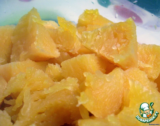 Тыкву, нарезанную небольшими кусочками, ставим вариться на пару (до мягкости - минут 20).