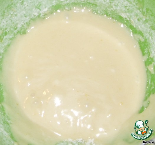 В получившееся густое тесто вливаем 0,5 стакана простокваши и хорошо размешиваем. Еще раз всыпаем 0,5 стакана муки, перемешиваем и доливаем 0,5 стакана простокваши. Опять сыплем 0,5 стакана муки, перемешиваем, опять доливаем 0,5 стакана простокваши. В последний раз всыпаем 0.5 стакана муки и доливаем 1 стакан простокваши. Хорошенько вымешиваем. Я пользуюсь миксером и получается очень быстро. Главное, ничего не перепутать.