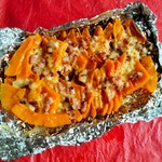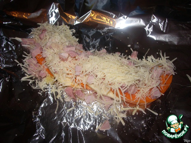 Посыпаем тертым сыром и мелко нарезанным окороком. Заворачиваем в фольгу и минут на 15 ставим в разогретую до 200 градусов духовку. Приятного аппетита!