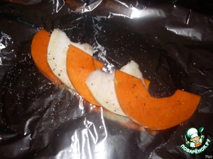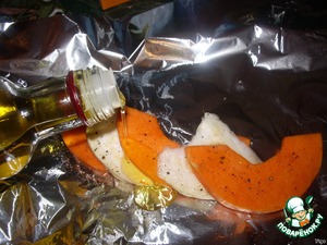 тыкву и сельдерей нрезаем тонкими дольками.Солим, перчим.