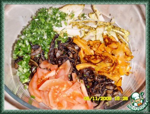 Сложить в миску (нарезанные пастрому, грибы, морковь - обжаренные), нарезать зеленый лук, помидор.