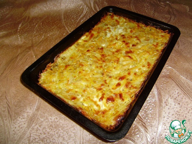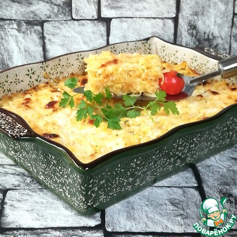 Выложить в форму, смазать майонезом или сметаной. Выпекать в духовке 180 градусов 30-40 минут. Запеканка получается красивая, с ярко выраженным вкусом сыра.