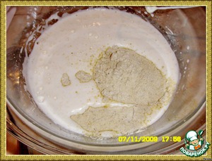 Получившуюся фисташковую муку смешать с разрыхлителем, добавить к яичной массе, перемешать.
