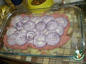 • Отварим картофель в мундире, почистим, порежем кольцами примерно 0,5 см. Противень обильно промажем маслом и в него выложим весь картофель, сверху немного посолить.