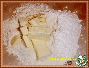В блендере (или вручную двумя ножами) порубить масло (113 г холодного), нарезанного кубиками, с мукой до образования крупной жирной крошки. -