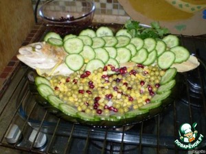 • Берем сок с рыбы и смешиваем его с зеленым горошком, кукурузой и гранатовыми зернами. Все это выкладываем в блюдо. А сверху выкладываем нашу рыбку. Огурец режем тонкими колечками и обкладываем нашу рыбку в виде чешуек. Вот что получилось в результате. Очень вкусно. Попробуйте.