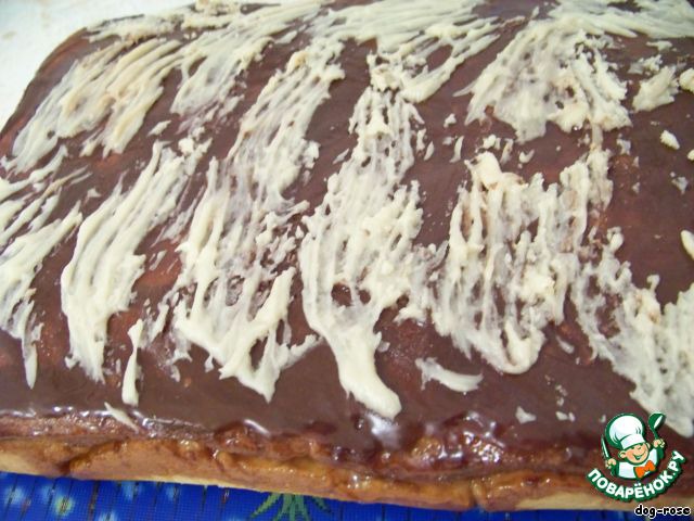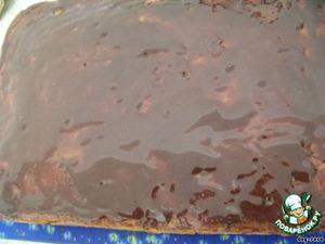 Далее делаем глазурь. Перемешиваем молоко, какао-порошок, сахар, немного провариваем до загустения, снимаем с огня и добавляем кусочек сливочного масла, перемешиваем, чтобы оно растопилось, и наносим глазурь на пирог.