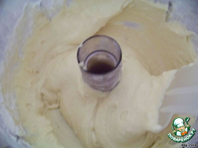 Теперь сдобное тесто. Взбиваем масло с сахарным песком, добавляем яйца, взбиваем. Добавляем муку, крахмал, разрыхлитель, сливки, взбиваем.