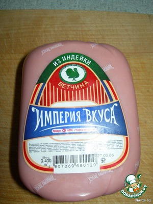 Необычное сочетание ветчины и соленых огурцов. Гостями съедается "на ура" :)