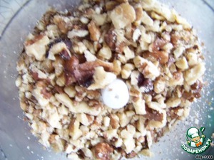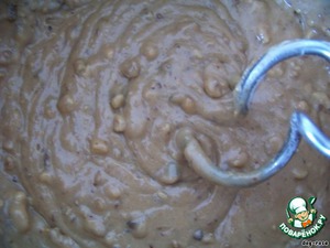 Смешиваем муку, орехи и разрыхлитель, высыпаем смесь в тесто, все как следует перемешиваем.