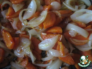 Морковку и лук режем полукольцами и пассеруем на растительном масле.